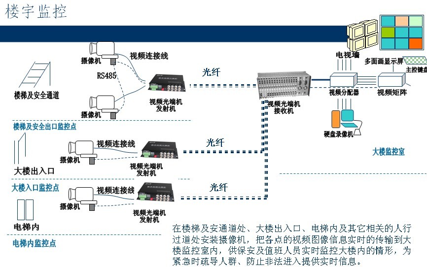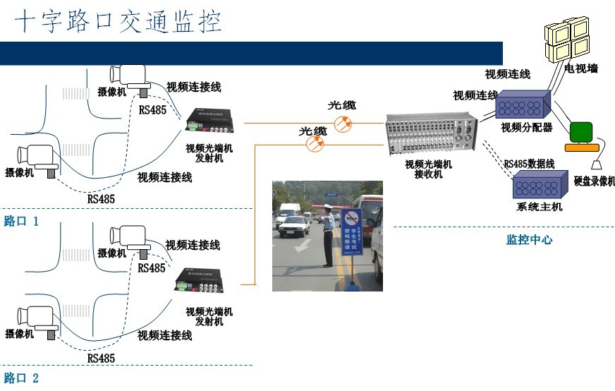 交通十字路口放置攝像機(jī),對(duì)十字路口的交通情況實(shí)時(shí)傳輸?shù)浇煌ü芾碇行?,可以及時(shí)發(fā)現(xiàn)處理道路擁堵、交通煩忙等狀況,并極積處理;同時(shí)對(duì)違章車(chē)輛和行人進(jìn)行監(jiān)控和錄像,處理提供證據(jù)